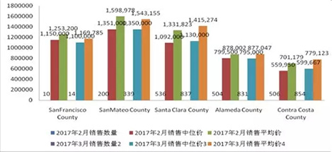 上圖給出了2017年3月和2016年3月灣區五縣獨立屋銷售的中位價和平均價。從圖上的銷售數據分析得出,2017年3月的銷售情況是: