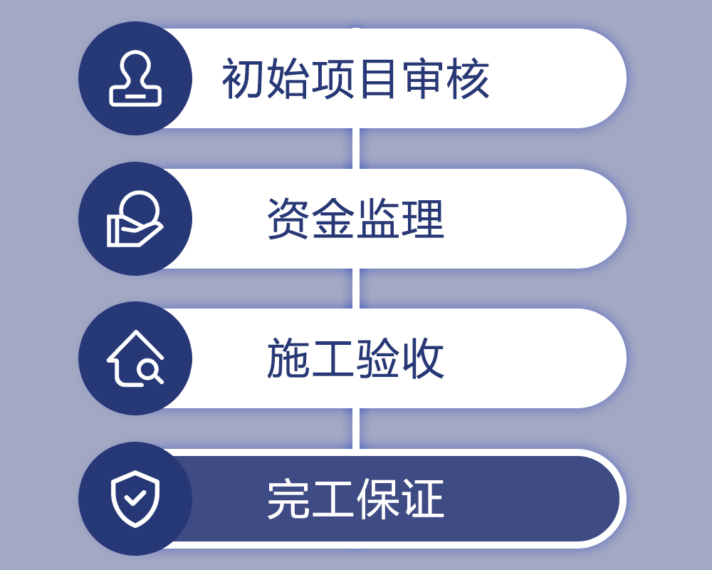 獨立第三方建筑監理公司將提供Initial Project Review (IPR 初始項 目審核), Fund Control (資金監理),Inspection Services (施工驗收)和Construction Completion Commitment (建筑完工保證)等幾項 綜合服務,為工程完工提供第二重保證機制。